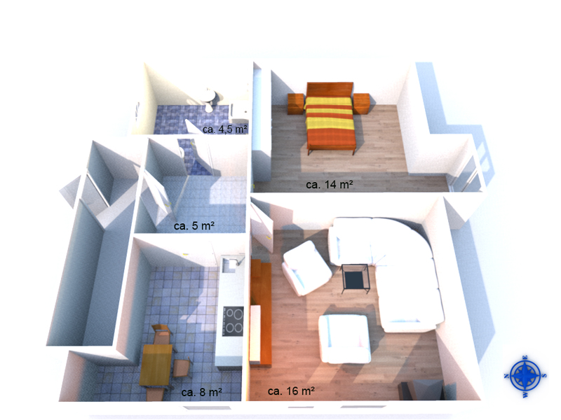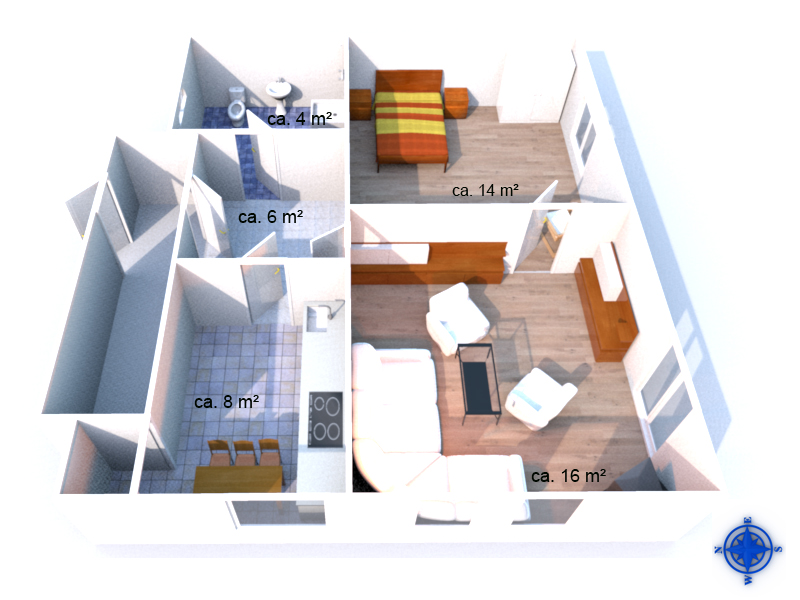 über die nach rechts führende Treppe kommen Sie zur FeWo 2. Auch hier betreten Sie die Wohnung vom Flur aus und können sich bei ca. 60 qm wohl fühlen. Die Aufteilung und Ausstattung entspricht ungefähr der FeWo 1, hat aber die eine oder andere schräge Wand. Trotzdem kein Grund sie nicht zu mögen. Zugang zur Terrasse erfolgt über den Hauseingang und den Gartenbr>