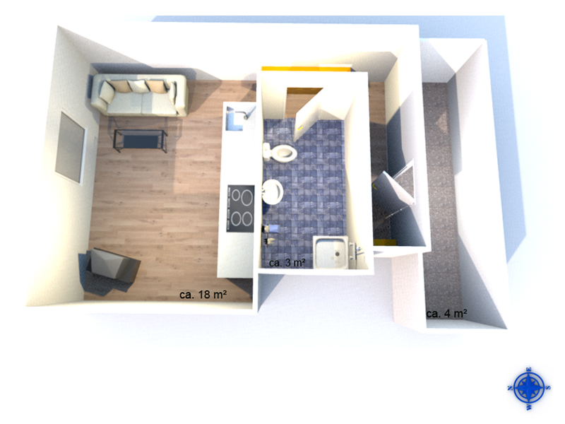 ebenfalls über die Treppe(dann links) gelangen Sie zur kleinsten FeWo . Gleich hinter der Wohnungstür finden Sie die Garderobe in einem Schrank verborgen, drei Stufen führen dann an der kleinen aber feinen Dusche vorbei. Dann stehen Sie auch schon im Wohnbereich mit Ausziehcouch, Küchenzeile und TV / HiFi-Anlage. Hier ist es etwas enger, aber für zwei Gäste recht gemütlich.